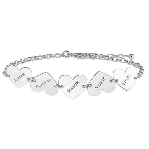 Een fraai zilveren armband met twee hartjes die aan elkaar verbonden zijn met daarin op een...