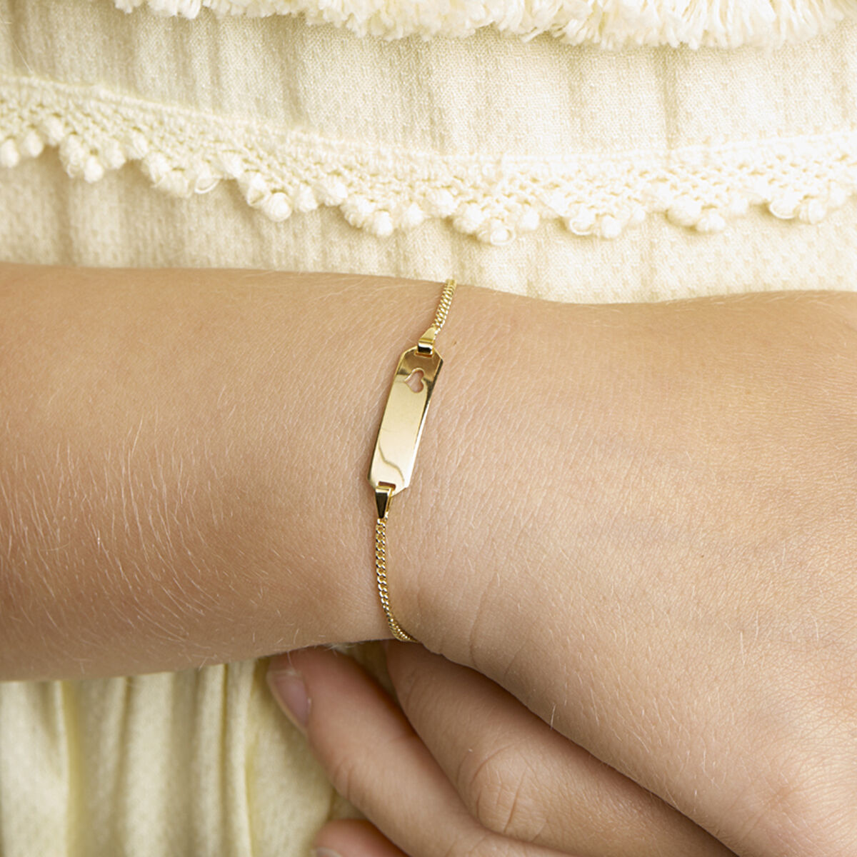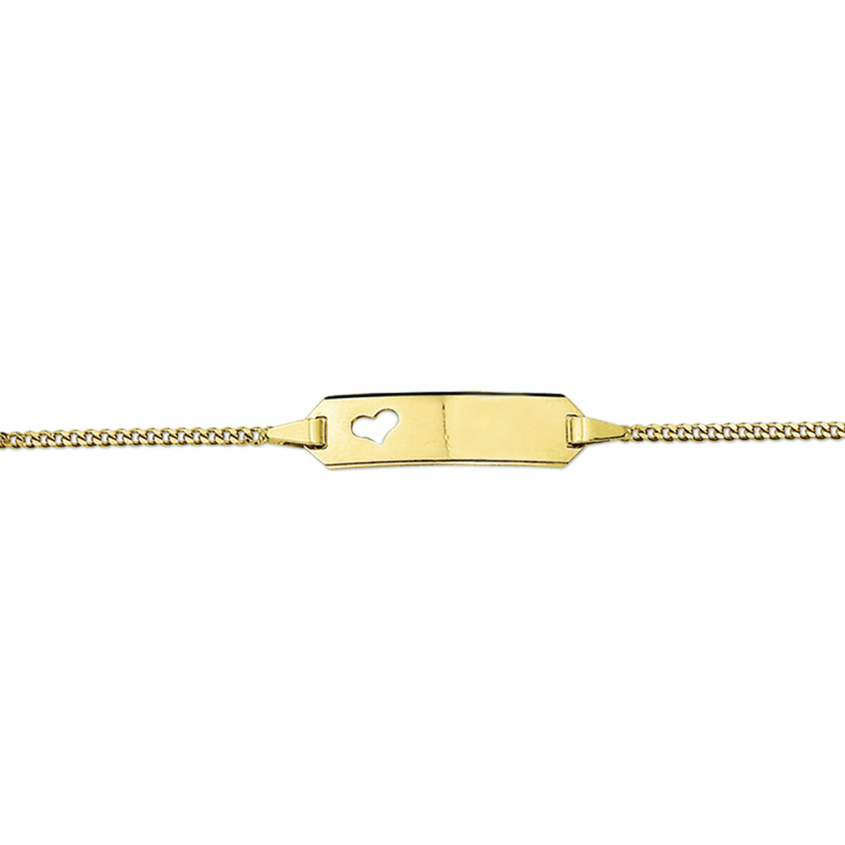 Het kinderarmbandje van 14k geelgoud is voorzien van een graveerplaatje van 5mm breed met uitgesneden hartje. U kunt dit laten graveren aan zowel de voor- als achterzjde met een naam, korte tekst of datum van maximaal 10 tekens (inclusief spaties en leestekens). Een hartje kunt u laten graveren door in het tekst veld (L) toe te voegen.