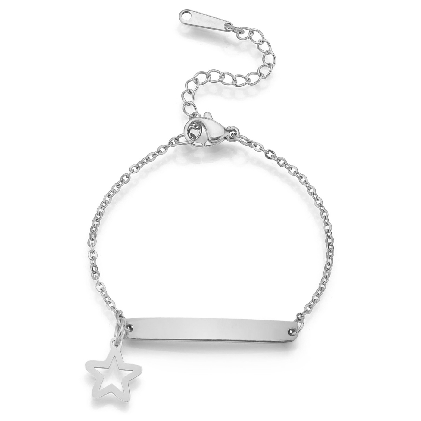 Dit stalen armbandje in prachtig hoogglans zilverkleur is verstelbaar van 12 tot 17cm. De schakels hebben een hoogte van 0,25 cm. Het graveerplaatje heeft een afmeting van 3 x 0,4cm en er is ruimte voor maximaal 10 tekens, inclusief spaties. Het sterretje heeft een afmeting van 1 x 1cm. De naam en/of datum wordt in hoge kwaliteit in het graveerplaatje van de armband gegraveerd, u heeft hierbij de keuze uit een sierlijke schrijfletter of een standaard blokletter: