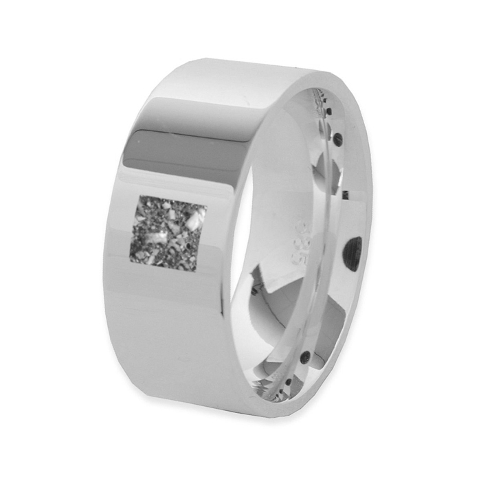 De ring heeft een breedte van 8mm en is voorzien van een open askamer welke zichtbaar is aan de buitenzijde van de ring in een vierkant vak. De open askamer wordt voor u gevuld door de goudsmid.