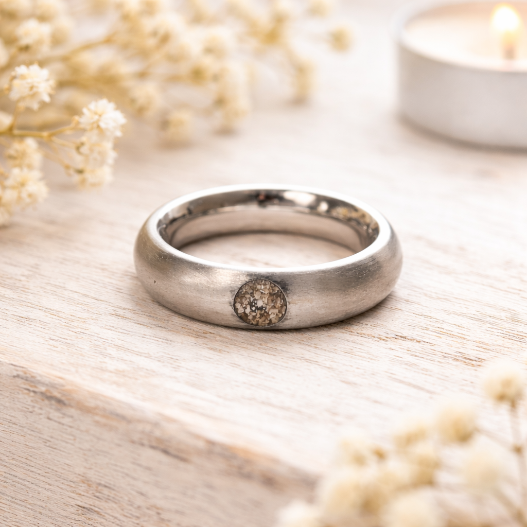 Een ring met as, waarin je iemand draagt die er niet meer is, maar altijd bij je blijft.