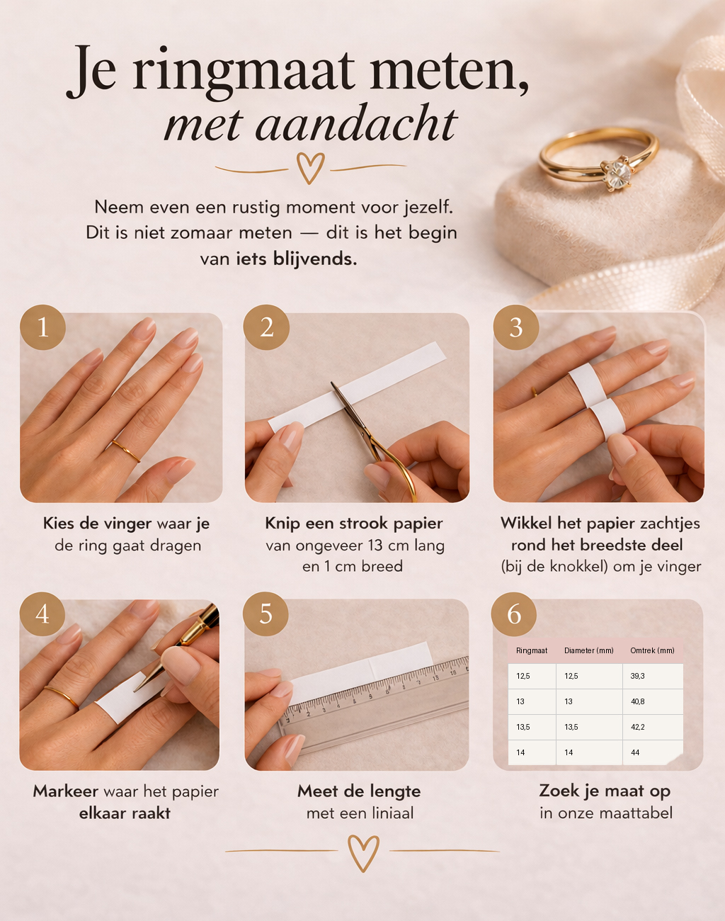 Bij Sieraadgraveren.be begrijpen we hoe bijzonder dit moment is. Daarom helpen we je stap voor stap om de juiste maat te vinden — met zorg en aandacht.