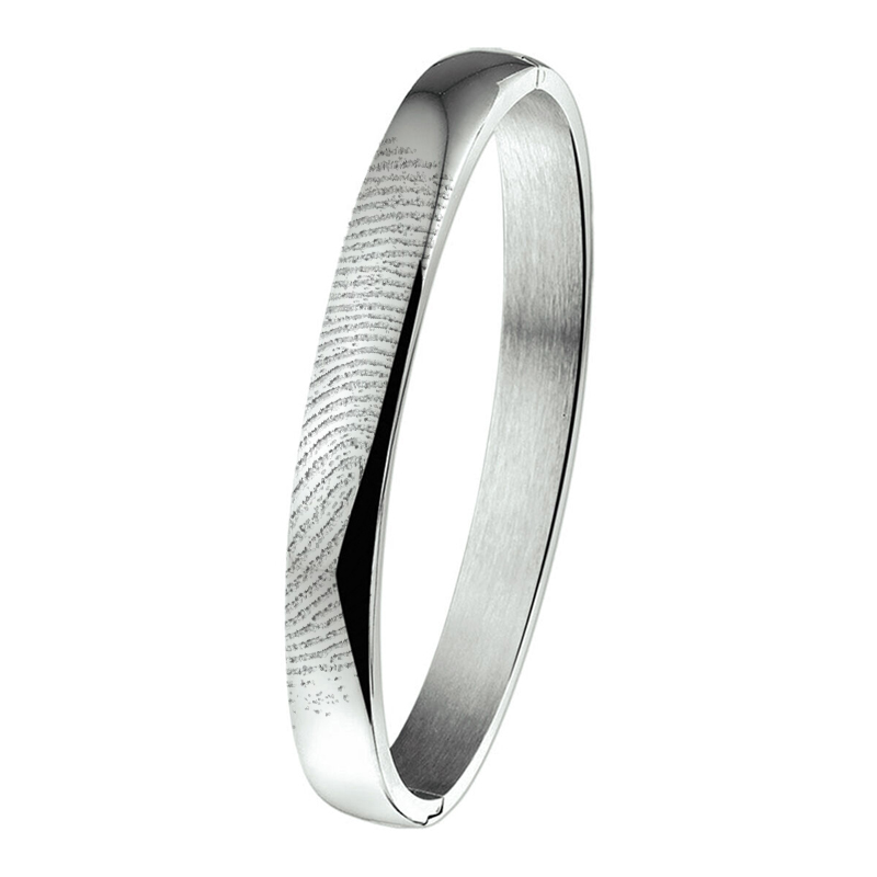 Deze RVS armband met vingerafdruk vormt een wel heel bijzondere manier om uw liefde uit te drukken. Op de scharnierarmband wordt met een laser een afbeelding van een vingerafdruk, handpalm, dierenpoot of babyhandje of –voetje gegraveerd. Door de toevoeging van de afdruk wordt de armband een blijvende herinnering aan een geliefde of dierbare. De scharnierarmband is verkrijgbaar in 2 maten en sluit met een scharnier en klemslot.