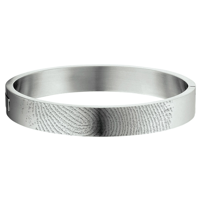 Deze RVS armband met vingerafdruk vormt een wel heel bijzondere manier om uw liefde uit te drukken. Op de scharnierarmband wordt met een laser een afbeelding van een vingerafdruk, handpalm, dierenpoot of babyhandje of –voetje gegraveerd. Door de toevoeging van de afdruk wordt de armband een blijvende herinnering aan een geliefde of dierbare. De scharnierarmband is verkrijgbaar in 2 maten en sluit met een scharnier en klemslot.