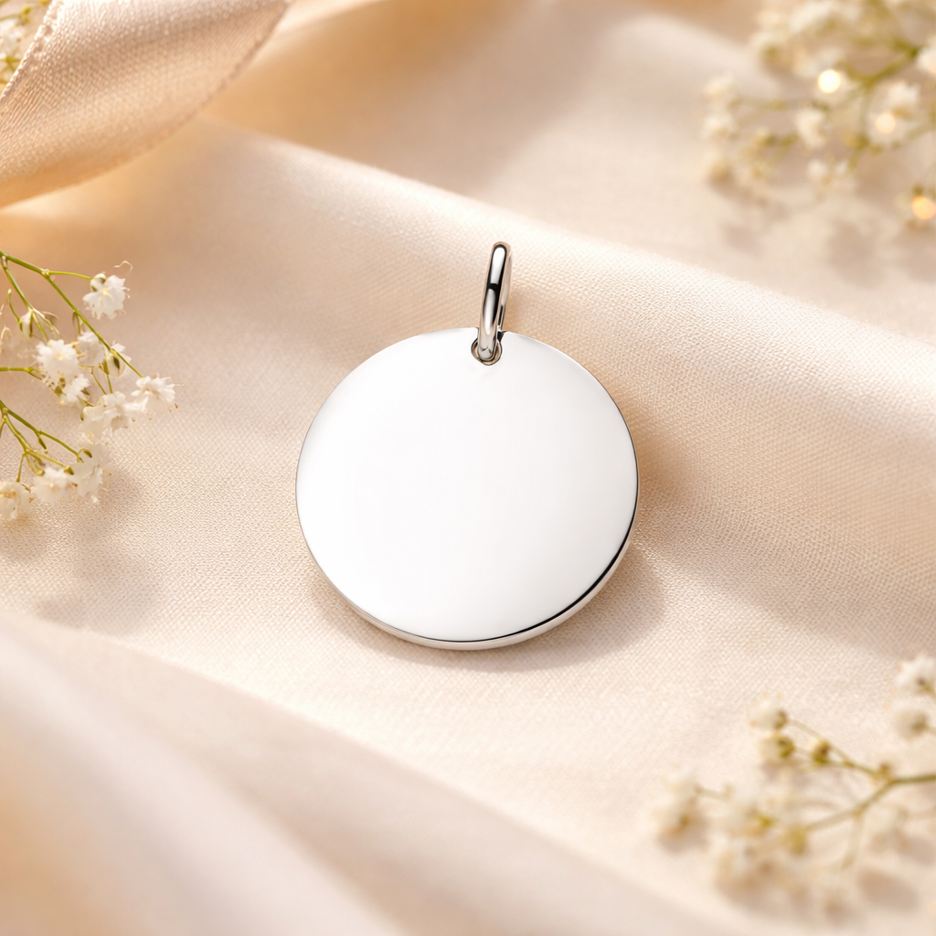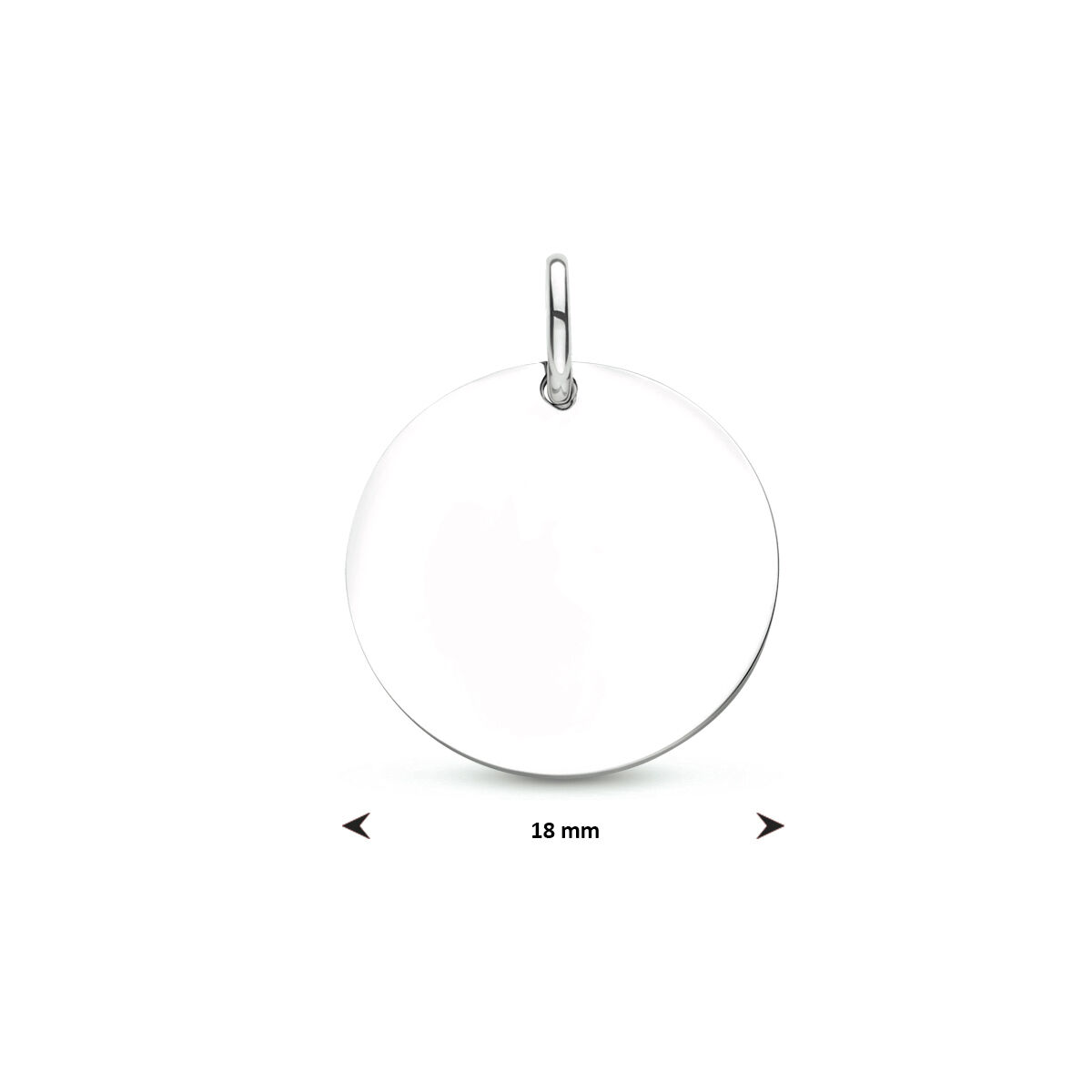 zilveren ronde hoogglans hanger met een diameter van 18mm. Laat de hanger graveren met een tekst, een logo of een foto naar keuze. De tekst voeg je toe in de vervolgstappen. Kies hier een leuk lettertype uit. Een logo of foto graveren? De afbeelding upload je eenvoudig in de volgende stappen.
