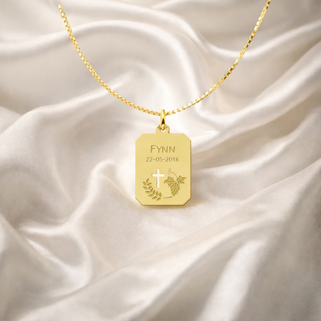 Maak deze gouden communiehanger persoonlijk door hem te laten graveren met een naam en communiedatum. De gravure wordt zorgvuldig in het juweel aangebracht, waardoor een uniek en blijvend aandenken ontstaat aan deze bijzondere dag.