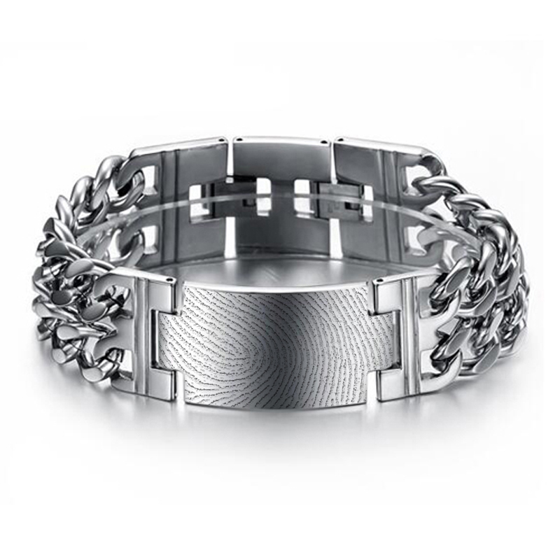 De edelstalen schakelarmband heeft een breedte van 26mm en wordt voorzien van een afdruk aan de buitenzijde van het slot. U kunt de armband laten graveren met één, twee of drie afdrukken in het slot of in het leer. De vingerafdruk wordt gegraveerd met een laser. U kunt ook een afdruk van een handpalm, voetje of dierenpootje laten graveren.