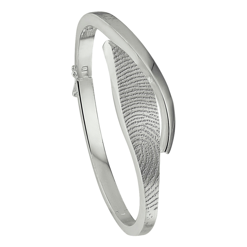 De sierlijke zilveren slaven armband heeft een breedte van 16mm en wordt voorzien van een afdruk aan de buitenzijde op het breedste gedeelte van de armband. U kunt de armband laten graveren met één, twee of drie afdrukken. De vingerafdruk wordt gegraveerd met een laser. U kunt ook een afdruk van een handpalm, voetje of dierenpootje laten graveren.